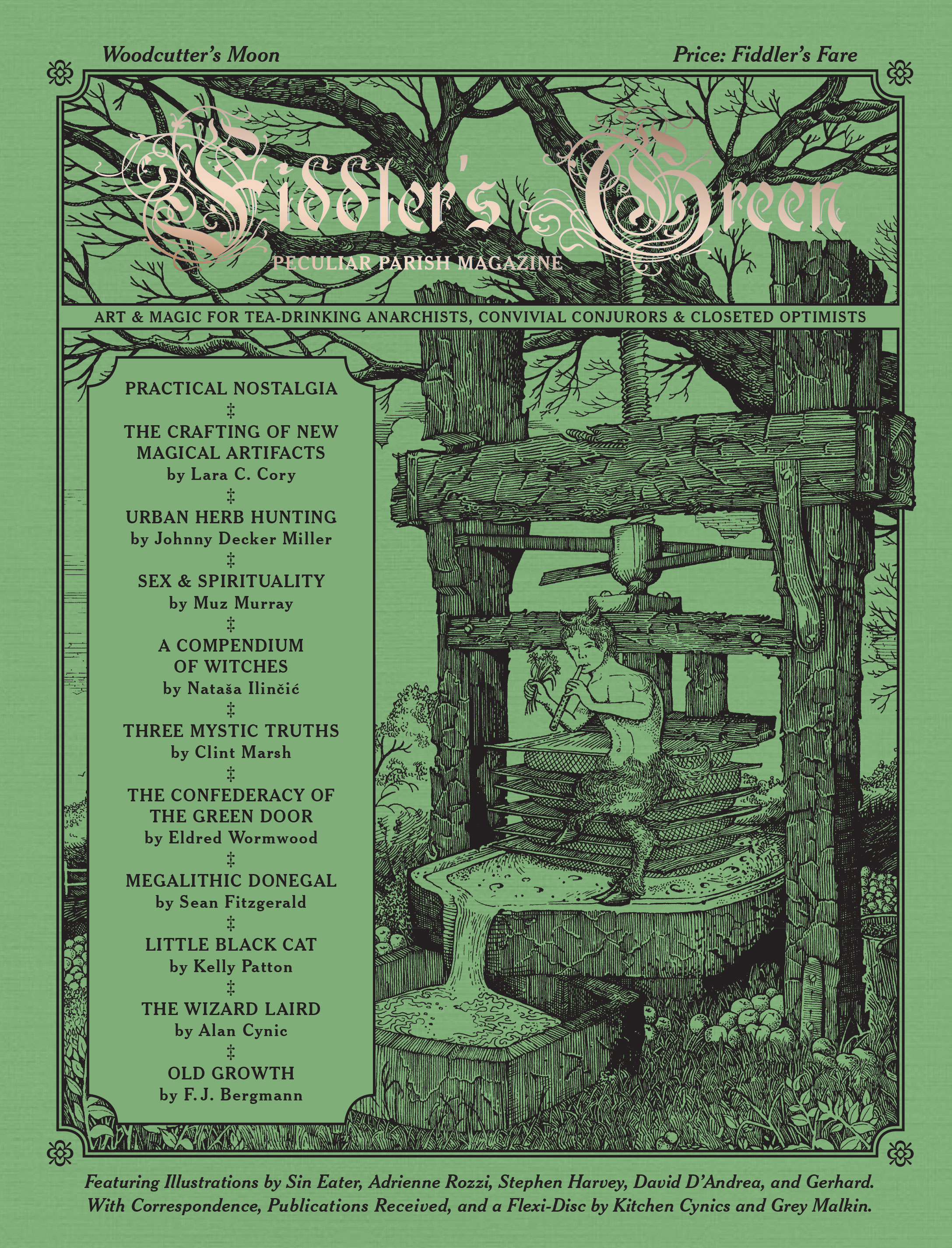 In our seventh issue, Fiddler’s Green Peculiar Parish Magazine interrogates the magical connections between the human spirit and what lies beyond. The featured articles in this issue explore the pervasive mysteries of death and new life, the layered meanings to be found in magical texts, the fate of all things once humankind is extinguished from the earth, a contrarian and devilishly useful means of genealogy, a means of spiritual commune with the half-angelic beings known as the Watchers, the woodcarver’s work in honoring the indwelling spirit of trees, a feminine approach to the hero’s journey of Joseph Campbell. This issue also includes a short story about an encounter with a nature spirit untethered to time. With letters from readers, reviews of publications received, and an accompanying flexi-disc song celebrating psychedelic abandon. The cover of Fiddler’s Green 7 is drawn by Benjamin Vierling. 52 pages, 55 illustrations.