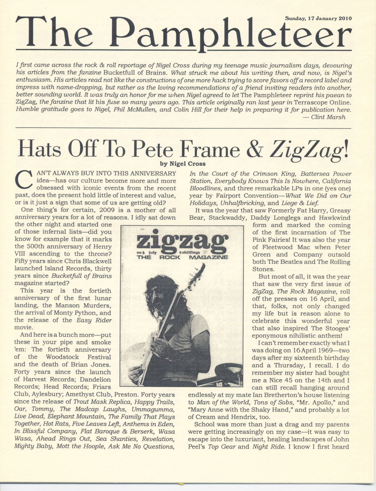 Rock journalist Nigel Cross recounts his formative teenage reading of early issues of Pete Frame’s ZigZag, and pays homage to the magazine’s 40th anniversary. Over the Garden Wall tells of the exodus of a bohemian enclave from Berkeley to nearby Kensington. The correspondence bubbles away over last issue’s devilish tale, and “Publications Received” looks at The Cincinnati Journal of Ceremonial Magick and H.P. Lovecraft’s Terrifying Escape. 8 pages, 11 illustrations.